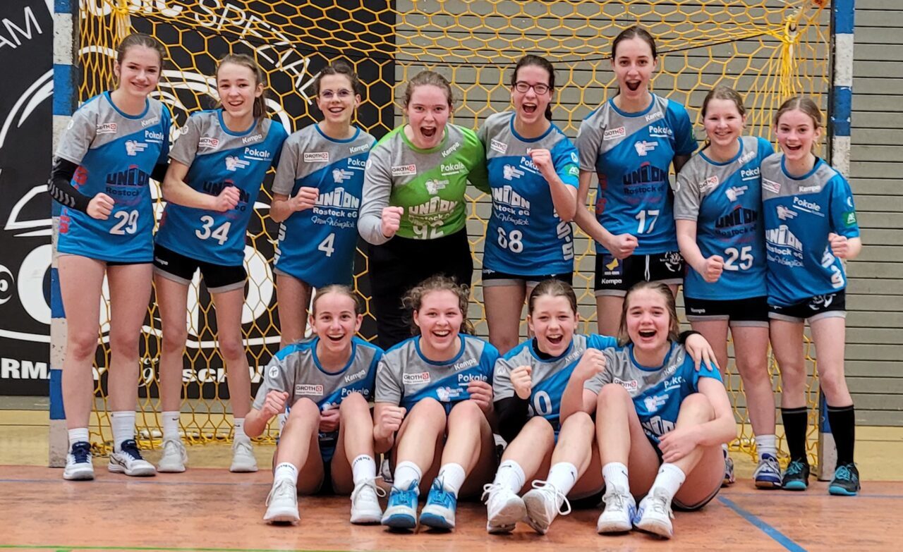 Ansonsten war es der erwartete Erfolg beim Tabellensechsten. Die Rostockerinnen gingen schnell mit 3:0 (4.) in Führung. Nach dem zwischenzeitlichen 2:3 der Grün Weißen (7.) zogen die Ostseestädterinnen das Tempo an und allmählich davon. Die Rostocker Abwehr hatte in der sehr gut aufgelegten Torhüterin Frieda „Finki“ Fink einen sicheren Rückhalt, im Umkehrspiel wurde das Spielgerät schnell nach vorn weitergeleitet und in der im ersten Durchgang geforderten offensiven Abwehr die Lücken gesucht. Insbesondere Charlize Tesch, die bereits am Samstag mit der B-Jugend gegen den SC Markranstädt auf der Platte stand und auch dort treffen konnte, zeigte immer wieder jenen absoluten Willen, den es braucht, um erfolgreich zu sein. Bereits zur Pause war der Vorsprung der Gäste mit 17:6 deutlich.